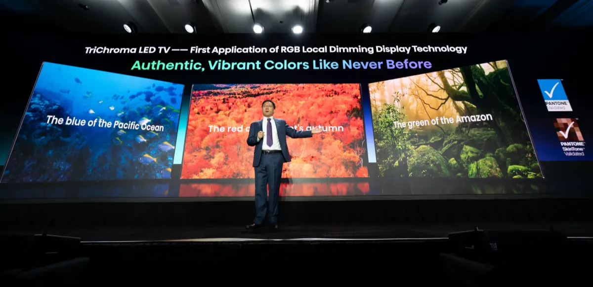 En el segmento MiniLED, Hisense destacó con su televisor LED TriChroma de 116 pulgadas, el más grande de su tipo en llegar al mercado. La tecnología TriChroma utiliza diodos LED rojos, verdes y azules independientes para generar colores puros directamente en la fuente, logrando una cobertura del 95% del espacio de color BT.2020.