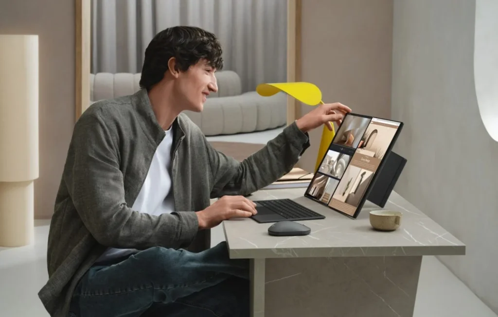 Uno de los modelos más innovadores fue la ASUS Zenbook DUO 2026, que perfecciona el concepto de doble pantalla. Incorpora dos paneles táctiles ASUS Lumina Pro OLED 3K de 14 pulgadas, con Dolby Vision, hasta 1000 nits de brillo y frecuencia variable de 48 a 144 Hz. El espacio entre pantallas se redujo un 70%, logrando una superficie de trabajo casi continua en un chasis más compacto de Ceraluminum.