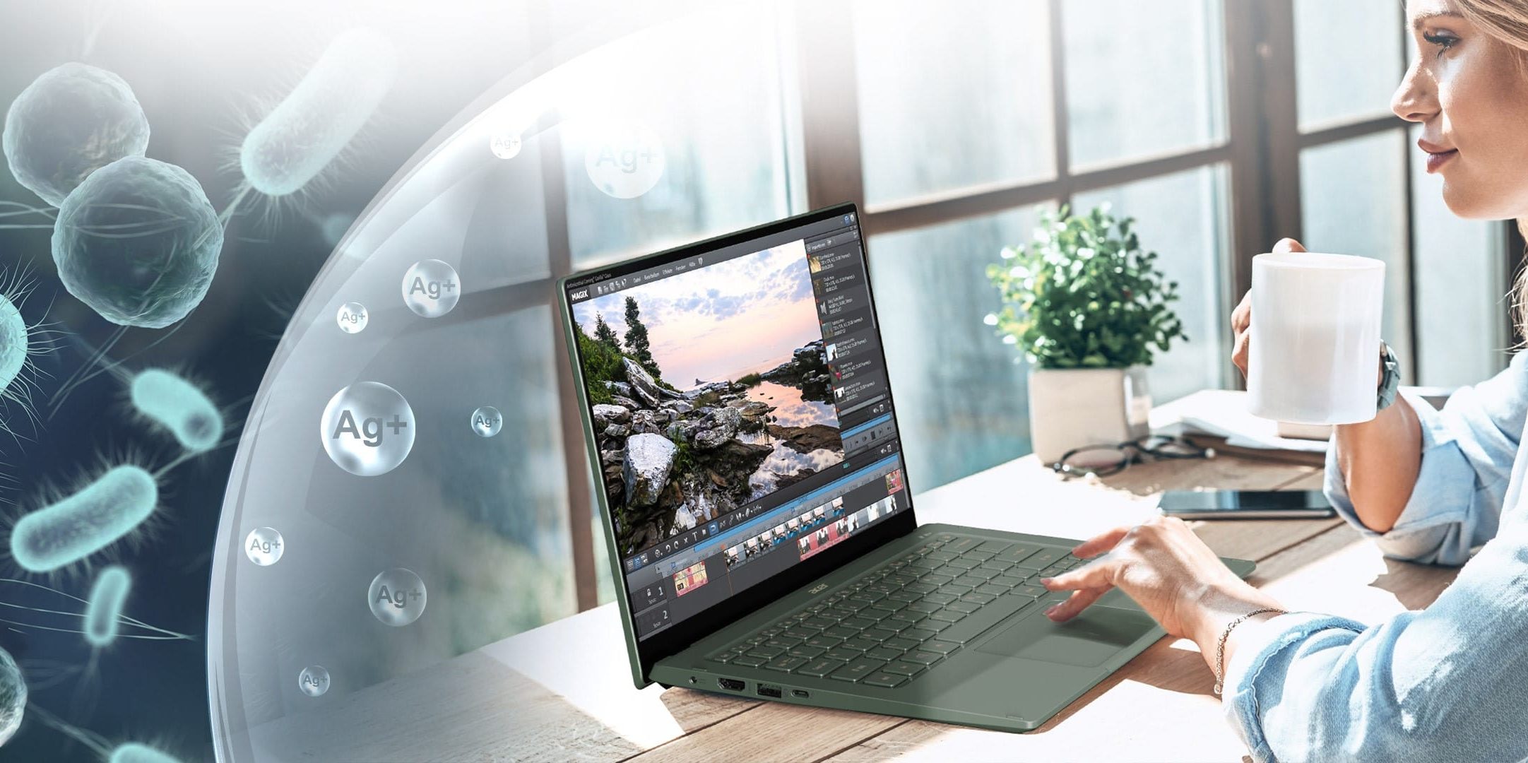 Se ha demostrado que un agente antimicrobiano de iones de plata compatible con BPR y EPA en el revestimiento de la superficie del chasis, el teclado, la bisagra, el lector de huellas digitales e incluso las etiquetas, presenta una tasa consistente de reducción microbiana de [3 log (>99,9 %)2] en un amplio rango de bacterias bajo el protocolo de prueba JIS Z 2801 e ISO 22196. Incluso, Acer ha incluido este material antimicrobiano basado en iones de plata en las bases de goma del equipo.