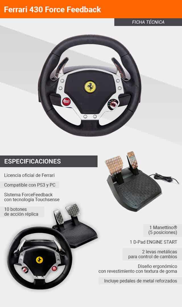 Y, para Playstation 3, tenemos disponible el Ferrari 430. Este volante tiene la particularidad de contar con Force Feedback, un sistema por el cual los volantes se dotan de un motor eléctrico que simula la sensación de conducción de un coche real: mayor o menor dureza en la dirección, temblor al pisar un bache o al tener un accidente, tirada en las curvas. Este volante también en compatible con PC.
